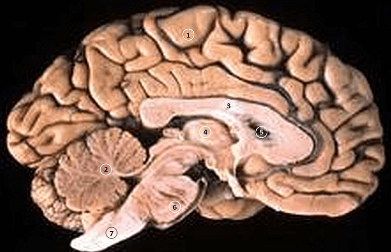 - Thalamus: dient als Relaisstation für sensorische und motorische Impulse zwischen Rückenmark und Medulla oblongata und dem Großhirn. Er spielt eine Rolle bei Schmerzempfindung, Aufmerksamkeit, Wachheit und Gedächtnis. Er erkennt sensorische Impulse wie Wärme, Kälte, Schmerz, Druck usw.