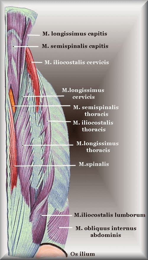 Die Muskeln liegen in einem osteofibrösen Kanal der knöchern von Wirbelbögen, Processus costales und Processus spinosi gebildet wird. Fibrös wird er nach hinten und lateral durch die Fascia thoracolumbalis begrenzt. Am M. erector spinae unterscheidet man den lateralen oberflächlichen und den medialen tiefen Trakt. Der laterale Trakt zieht vom Becken bis zum Schädel; er besteht aus langen Muskelelementen.