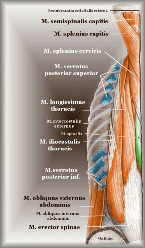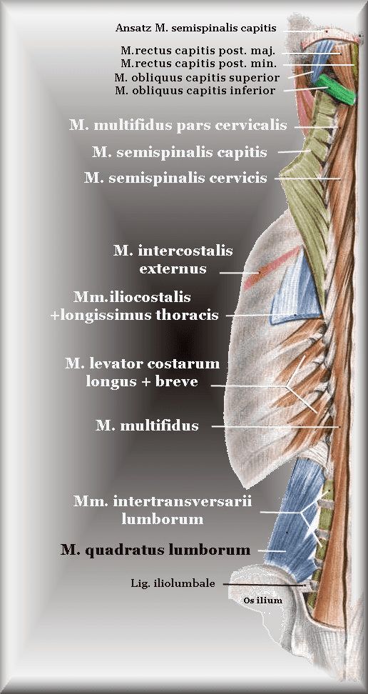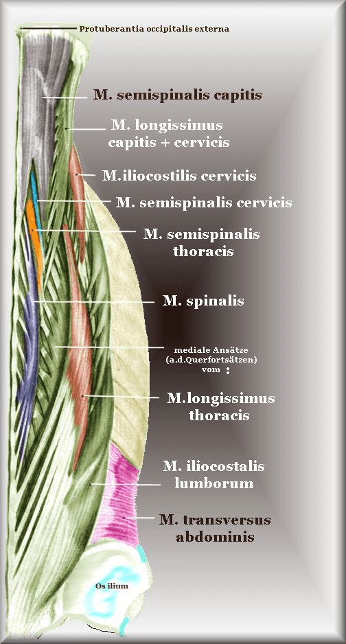 Der M. iliocostalis thoracis reicht von den unteren 6 bis zu den oberen 6 Rippen, während der M. iliocostalis cervicis von der 6.-3. Rippe entspringt und an den Querfortsätzen des 6.-4. Halswirbels ansetzt. Innervation: Rr. dorsales (C4-L3).