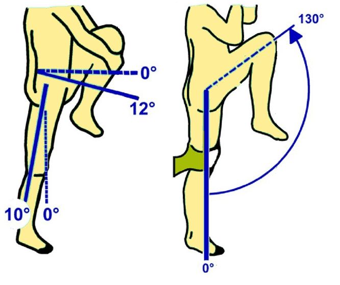Eine Liste der physiologischen Werte für die Neutral-Null-Methode für verschiedene Auslenkungen / Bewegungen der Gelenke der unteren Extremitäten.