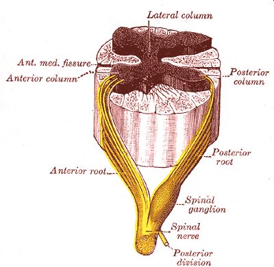 Jeder Spinalnerv entsteht aus den vereinigten ventralen und dorsalen Wurzelfasern (Radix ventralis und dorsalis) aus dem Rückenmark. Sie sind relativ kurz (meist etwa 1 cm).